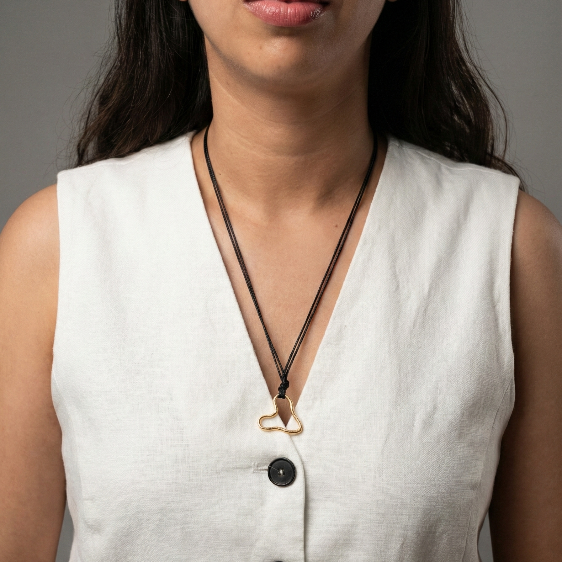 This sculpted heart pendant is crafted in a fluid, open form and suspended on a sleek black cord for a contemporary edge. Designed to sit close to the heart, it’s a symbol of quiet emotion and individuality — easy to style with everyday outfits or layered for a bolder statement.